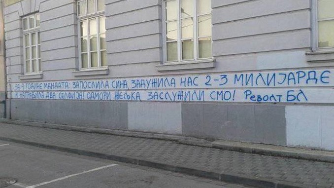 U Centru Banje Luke jutros je osvanuo grafit posvećen četvrtoj godišnjici premijerskog mandata Željke Cvijanović. Grafit je potpisan sa „Revolt BL“.